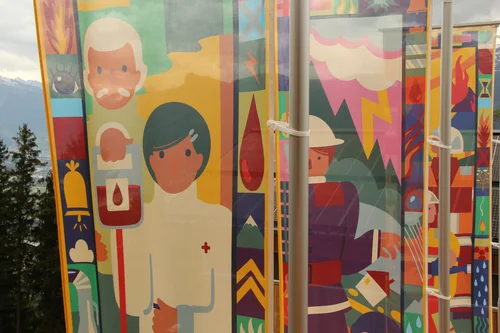 Das Kunstprojekt “Jalousie” wurde entwickelt, um eine gewisse Privatsphäre in diesen Räumen zu ermöglichen, einen sanften Farbakzent ins helle Gebäude zu setzen und durch ausgewählte Bildmotive das gesamte Land im Dienstleistungszentrum zusammenzubringen.