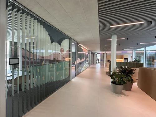 Jedes Besprechungs- und Sitzungszimmer im EG hat ein eigenes Bildmotiv erhalten, das auf eine vertikale Jalousie gedruckt wurde.